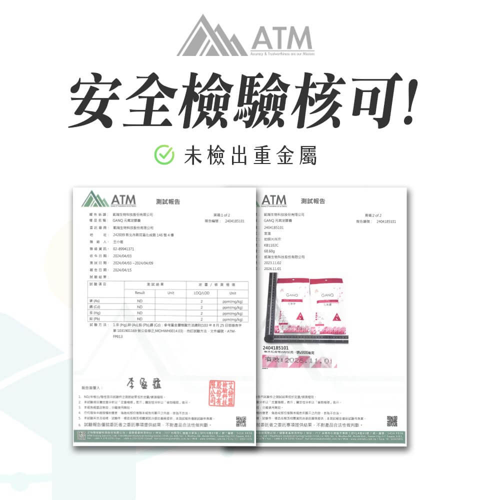 - 成份:β-菸醯胺單核苷酸(NMN)(酵母來源)/β-Nicotinamide Mononucleotide、穀胱甘肽/Glutathione、還原型輔酶Q10/Coenzyme Q10(Ubiquinol)、可可粉(含PQQ)/Pyrroloquinoline Quinone、紅藻萃取(含蝦紅素)/Astaxanthin